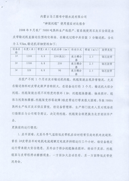 - 節(jié)能效果顯著的帶式輸送機(jī)。托輥旋轉(zhuǎn)阻力?。ㄖ睆?9—108mm,平均≤1—1.2N)軸承不污染,不但使帶式輸送機(jī)系統(tǒng)的運(yùn)行阻力系數(shù)?。▽?shí)際運(yùn)行阻力系數(shù)0.013—0.015),并且自始至終不變化,可以大幅度減小配置功率中的儲備功率。另外,布置在系統(tǒng)中的多動力電動托輥,可以隔組接通電源線,分別控制帶動力運(yùn)轉(zhuǎn)。這樣,就可以根據(jù)帶式輸送機(jī)系統(tǒng)的實(shí)際運(yùn)行電流,啟動部分電動托輥帶動力運(yùn)轉(zhuǎn),巧妙地降低配置功率50%左右。 ※《客戶使用對比》 ※ 客戶案例實(shí)拍圖片