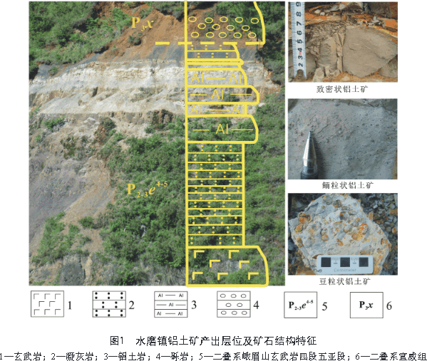 圖1水磨鎮(zhèn)鋁土礦產(chǎn)出層位及礦石結(jié)構(gòu)特征