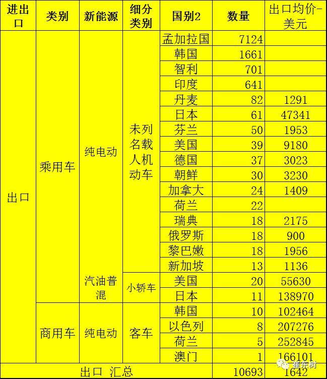 17年6月的新能源乘用車出口主要是孟加拉、韓國、美國、印度等市場,部分小于4位數(shù)的出口單價就不寫上為好。由于總體單價在1642美元,檔次不是很高。