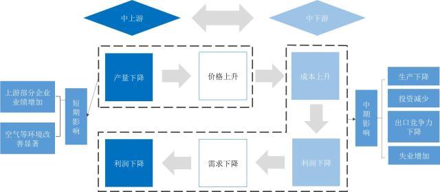 資本市場,一個廣為流傳的所謂邏輯是環(huán)保限產(chǎn)短期內(nèi)會對部分周期性產(chǎn)品價格產(chǎn)生支撐作用,但中期環(huán)保限產(chǎn)帶來的供給下滑會對經(jīng)濟基本面產(chǎn)生負面影響。在這一所謂邏輯下,“2+26”城市采暖期限產(chǎn)、環(huán)保督察嚴格落實,部分產(chǎn)品供給將出現(xiàn)顯著下滑(電解鋁、粗鋼、水泥等限產(chǎn)規(guī)模占比將超過8.4%、11.1%和16.3%),短期內(nèi)相應產(chǎn)品的價格會出現(xiàn)明顯上升。中期來看,上游直接關停,中下游因原材料成本上升導致利潤縮窄,下游需求下降抵消價格上漲,繼而引發(fā)生產(chǎn)放緩、投資下滑。同時,環(huán)保容忍度提升降低出口競爭力,帶來失業(yè)和消費能力的降低。長期來看,環(huán)保限產(chǎn)不能增加環(huán)保設備、缺乏市場化手段來內(nèi)生環(huán)境成本,以至于高效產(chǎn)能面臨關停的窘境,最終對產(chǎn)業(yè)升級難起作用。