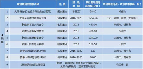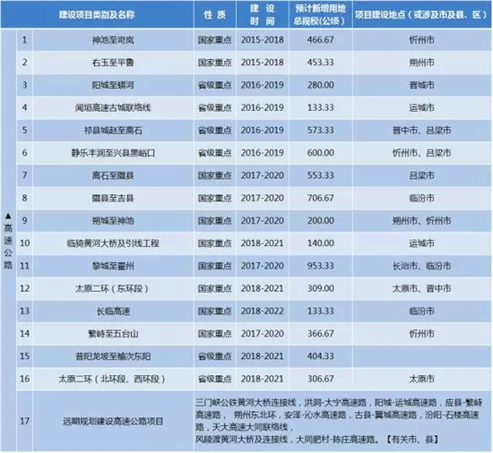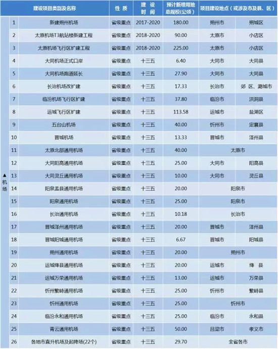 山西省在通知中公布了“十三五”期間,將要新增的重點(diǎn)建設(shè)工程(項(xiàng)目)及用地情況,涵蓋了交通建設(shè)類、水利建設(shè)類、能源建設(shè)類、煤化工及其他、扶貧移民搬遷、其他建設(shè)(園區(qū))等六大類,山西省馬上就要新建25個(gè)機(jī)場(chǎng)、9條鐵路、16條高速、20條干線公路…...
