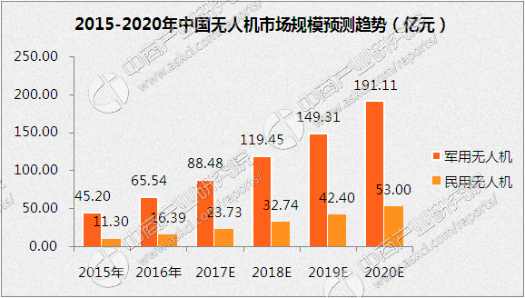 根據(jù)中商產(chǎn)業(yè)研究院發(fā)布的《2017-2022年中國無人機(jī)市場發(fā)展前景及投資機(jī)會(huì)分析報(bào)告》數(shù)據(jù)顯示,2015年中國民用無人機(jī)市場銷售規(guī)模達(dá)到11.3億元。隨著無人機(jī)應(yīng)用領(lǐng)域的逐漸擴(kuò)大,無人機(jī)市場需求逐漸提升,預(yù)計(jì)2017年中國民用無人機(jī)市場規(guī)模將達(dá)到23.73億元。2017年中國軍用無人機(jī)市場規(guī)模將達(dá)到88.48億元,未來將保持持續(xù)穩(wěn)定增長。預(yù)計(jì)到2020年中國民用無人機(jī)市場將達(dá)53億元,軍用無人機(jī)將達(dá)191.11億元,中國無人機(jī)市場總規(guī)模將超200億元。