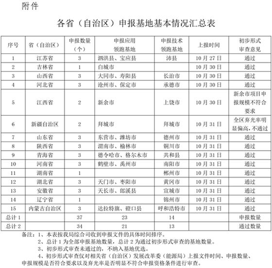現(xiàn)我局按截止時(shí)間對(duì)相關(guān)省(自治區(qū))發(fā)展改革委(能源局)申報(bào)文件進(jìn)行了統(tǒng)計(jì)和初步形式審查。截至10月31日,共有15個(gè)?。ㄗ灾螀^(qū))向我局正式提交了共37個(gè)光伏發(fā)電領(lǐng)跑基地申報(bào)材料,其中包含23個(gè)應(yīng)用領(lǐng)跑基地和14個(gè)技術(shù)領(lǐng)跑基地;共有14個(gè)?。ㄗ灾螀^(qū))的34個(gè)光伏發(fā)電領(lǐng)跑基地通過(guò)了初步形式審查,其中包含21個(gè)應(yīng)用領(lǐng)跑基地和13個(gè)技術(shù)領(lǐng)跑基地。為保障領(lǐng)跑基地優(yōu)選工作公平、公正、公開(kāi),現(xiàn)按類別對(duì)申報(bào)基地的基本情況予以公開(kāi)。