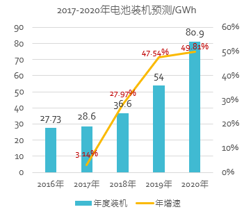 在這種預(yù)測(cè)前提下,磷酸鐵鋰電池將以14.18GWh的裝機(jī)量依舊排在榜首,但是與2016年的19.88GWh相比,下降幅度高達(dá)28.62%,市場(chǎng)份額也因此由2016年的72.7%下降到今年的不足50%。三元電池將達(dá)到12.81GWh的裝機(jī)量,同比增速超過(guò)80%,市場(chǎng)份額由2016年的不到26%上升到45%。