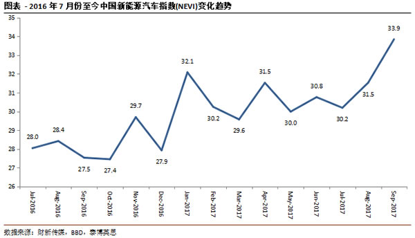 10月28日,中國(guó)新能源汽車(chē)指數(shù)2.0版(以下簡(jiǎn)稱(chēng)NEVI)最新數(shù)據(jù)顯示,2017年9月NEVI綜合指數(shù)為33.9,較上月上升2.4。其中,排名前五的城市依次為上海、深圳、北京、廣州和杭州。