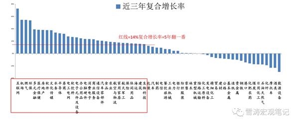 沿著資本開支在行業(yè)之間的轉(zhuǎn)移方向,我們選擇了近三年資本支出復(fù)合增長率在14%以上的行業(yè),這意味著這些行業(yè)的資本規(guī)模平均每5年翻一番。