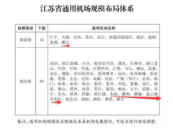 根據(jù)《江蘇省“十三五”及中長期通用機(jī)場布局規(guī)劃》(簡稱“規(guī)劃”)顯示,全省通用機(jī)場將在“十三五”布局16個(gè),至2020年布局35個(gè),遠(yuǎn)期布局規(guī)模為70個(gè)(包括10個(gè)國家級(jí)通用機(jī)場和60個(gè)市級(jí)通用機(jī)場)。其中,就包括灌云、東海、灌南、贛榆、開發(fā)區(qū)5個(gè)通用機(jī)場。
