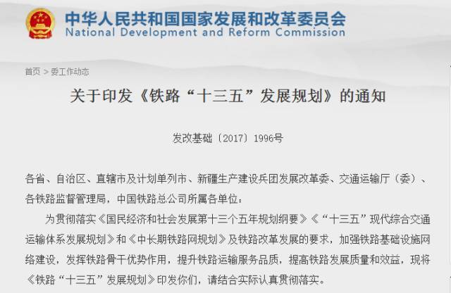 11月24日,國家發(fā)改委在官網(wǎng)重磅發(fā)布《鐵路“十三五”發(fā)展規(guī)劃》。