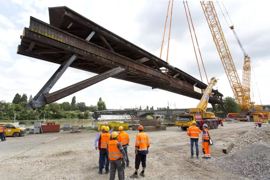 作為斯圖加特21基礎(chǔ)設(shè)施項(xiàng)目的一部分,必須拆除一座人行天橋,以便在巴登-符騰堡州首府新建一座鐵路橋。起重機(jī)承包商Wiesbauer將其利勃海爾LG 1750桁架臂起重機(jī)組裝在內(nèi)卡河河岸上用以移除木橋。盡管橋梁重量明顯高于預(yù)期,但利勃海爾起重機(jī)成功完成了這項(xiàng)工作。