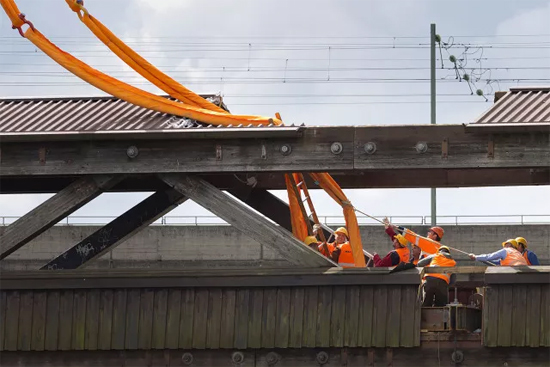 項(xiàng)目規(guī)劃人員在抽取材料樣本并審核設(shè)計(jì)文件后,預(yù)計(jì)該橋總重量為110噸。然而,當(dāng)屋頂木橋被吊起來的時(shí)候很快就清楚了,它比計(jì)算的重得多。直到LG 1750的起重機(jī)機(jī)艙顯示總重142噸的情況下,橋腳才從橋墩和河墩駛離,剩下的就很容易了。木結(jié)構(gòu)慢慢地在內(nèi)卡河上方擺動(dòng),并放在岸邊進(jìn)行最后的拆除。重量差異是由于安裝了大量的角撐板和鐵增強(qiáng)件。