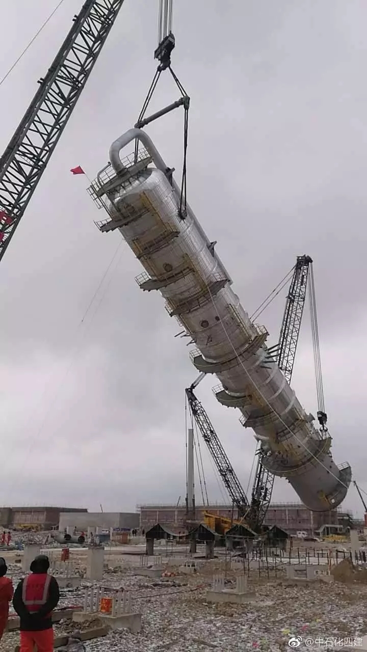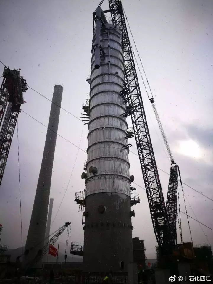 1月8日,中石化四建公司發(fā)布微博消息:大連恒力項目T-5101順利吊裝成功!以下是微博配圖。