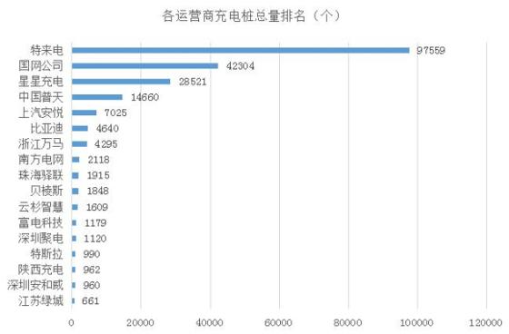 充電運(yùn)營(yíng)商方面,特來電投建并運(yùn)營(yíng)了97559個(gè)充電樁,占比46%,位居第一。第二名國網(wǎng)42304 個(gè),占比20%。隨后是星星充電28521個(gè)和中國普天14660個(gè)。四大運(yùn)營(yíng)商累計(jì)占到市場(chǎng)總量的86%。