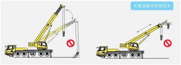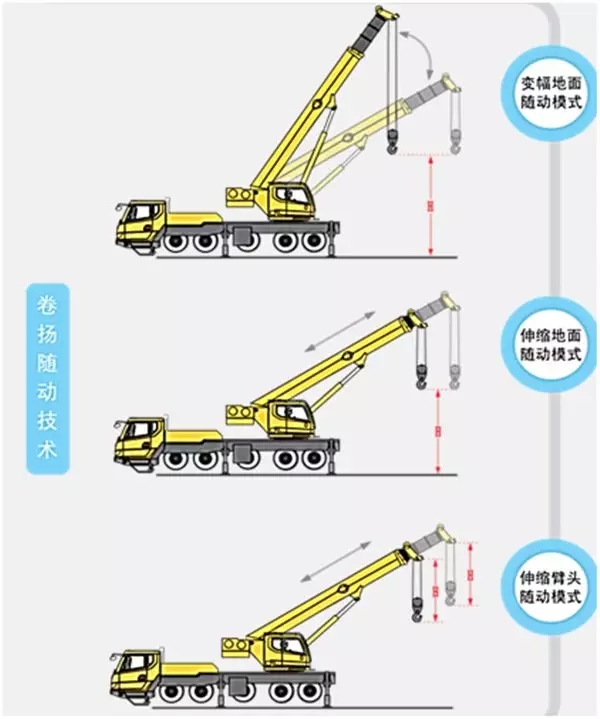 對(duì)于這些問題,徐工的工程師們也給出了完美的解決方案,這就是我接下來要說的“卷?yè)P(yáng)隨動(dòng)技術(shù)”,總的來說這項(xiàng)技術(shù)能實(shí)現(xiàn)兩項(xiàng)動(dòng)作:一是,在變幅和伸縮時(shí),吊鉤與地面的距離保持不變,這樣就避免了吊鉤觸碰到地面;二是,在伸縮時(shí),吊鉤與臂頭之間的距離保持不變,有效解決了吊鉤碰到臂頭的隱患。