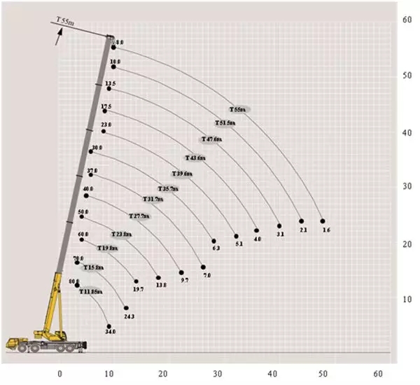 6節(jié),“U”形截面的筒形焊接結(jié)構(gòu),單板式臂頭、緊湊式臂尾。單缸插銷伸縮機(jī)構(gòu) 主臂長(zhǎng)度:11.85m~55m。由連接架、旋轉(zhuǎn)架和兩節(jié)桁架結(jié)構(gòu)折疊式副臂組成, 副臂長(zhǎng)度:10.5m、17.5m。
