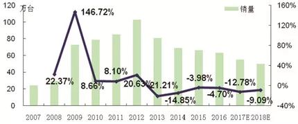 2007~2016年收獲機(jī)械銷售走勢與2017年2018年市場預(yù)測