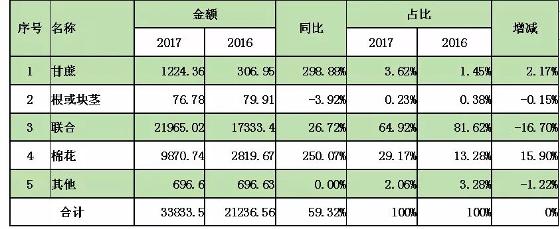 值得注意的是,根莖或塊莖和棉花收獲機(jī)出口量和出口額均出現(xiàn)不同程度的攀升,海關(guān)統(tǒng)計(jì)顯示,截至2017年11月底,進(jìn)口量分別為131臺和47臺,同比分別增長2.34%和291.67%;實(shí)現(xiàn)進(jìn)口額分別為1619.38萬美元和2194.02萬美元,同比分別大幅度攀升29.56%和280.43%。