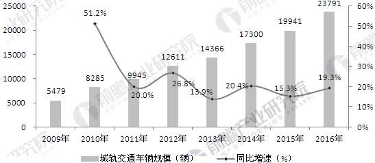 2009-2016年城軌交通車輛規(guī)模趨勢圖(單位:輛,%)