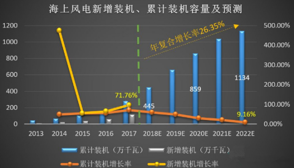 海上風(fēng)電新增裝機、累計裝機及預(yù)測(至2022年)
