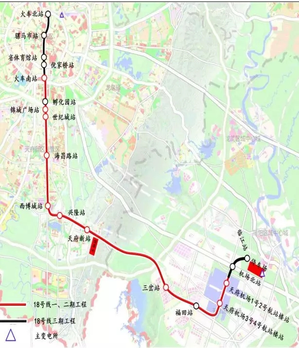 成都軌道交通18號線線路圖中的天府新站,即天府樞紐站,位于興隆湖附近。