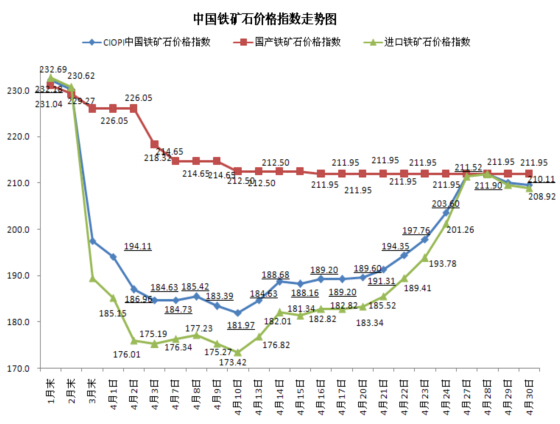 4月末,中國鐵礦石價格指數(shù)(CIOPI)為209.59點,環(huán)比上升12.10點,升幅為6.13%,環(huán)比由降轉(zhuǎn)升。其中:國產(chǎn)鐵礦石價格指數(shù)為211.95點,環(huán)比下降14.10點,降幅為6.24%,較上月加大4.84個百分點;進口鐵礦石價格指數(shù)為208.92點,環(huán)比上升19.43點,升幅為10.25%,環(huán)比由降轉(zhuǎn)升。(見下表)
