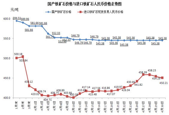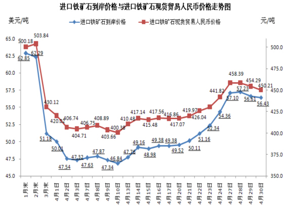 4月份,受需求下降影響,鋼材市場持續(xù)疲軟,而鋼鐵生產(chǎn)仍維持較高水平。受國外高成本礦山停產(chǎn)減產(chǎn)以及國內(nèi)鐵礦石期貨逼空等因素影響,進口鐵礦石價格在中下旬出現(xiàn)明顯反彈。后期鐵礦石供大于求矛盾依然突出,鐵礦石價格將以波動運行為主。