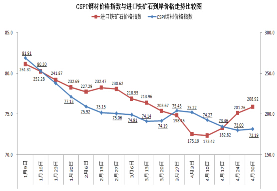 據(jù)鋼鐵協(xié)會統(tǒng)計,一季度會員鋼鐵企業(yè)實現(xiàn)利潤為-9.87億元,虧損面達49.50%;4月末,CSPI國內(nèi)鋼材綜合價格指數(shù)為73.19點,環(huán)比下降2.24點,降幅為2.97%。而同期CIOPI進口鐵礦石價格從4月10日的低點46.84美元/噸起,上漲至月中高點57.23美元/噸,反彈幅度在20%以上。在產(chǎn)能過剩、需求疲軟、鋼價低迷的情況下,鐵礦石價格缺乏持續(xù)反彈的條件。