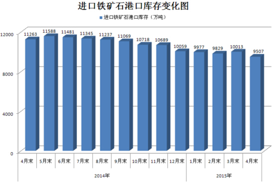 4月末,全國進口鐵礦石港口庫存量9507萬噸,環(huán)比減少506萬噸,降幅為5.05%。一季度,全國生鐵產(chǎn)量為1.77億噸,同比下降411萬噸,降幅為2.3%,而鐵礦石進口量達2.27億噸,同比增加533萬噸。雖然國內(nèi)外高成本礦山出現(xiàn)停產(chǎn)限產(chǎn),但國外三大礦山低成本鐵礦石供應充足,國內(nèi)礦山在國家調(diào)減資源稅征收比例后也會釋放一定的產(chǎn)能,國內(nèi)市場鐵礦石供大于求的態(tài)勢未有根本性變化。(見下圖)