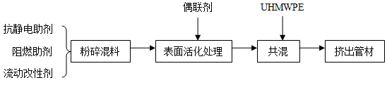 UHMW-PE的阻燃、抗靜電及易加工復(fù)合改性采用了無鹵阻燃抗靜電改性方法,其為將100份的超高分子量聚乙烯、5-15份導(dǎo)電材料、1-5份聚磷酸銨、0.1-10份聚硅氧烷、1-10份納米阻燃劑、1-10份聚合物界面橋粘劑、1-8份分散劑以及0.5-4份抗氧化劑經(jīng)反應(yīng)釜進行混配,然后將混合物用單螺桿擠出機擠出成型管材。配方中的導(dǎo)電材料選自炭黑、石墨和銅粉中的一種或一種以上的混合物,聚磷酸銨是晶體結(jié)構(gòu)為Ⅱ型的聚磷酸銨,聚硅氧烷選自聚二甲基硅烷、聚甲基苯基硅氧烷和線性硅氧烷-乙炔共聚物的一種或一種以上的混合物,納米阻燃劑選自粒徑為10-100納米的二氧化硅、滑石粉和氫氧化鎂中的一種或一種以上的混合物。