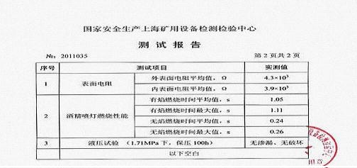 阻燃和抗靜電改性UHMW-PE管材礦安檢測結(jié)果: