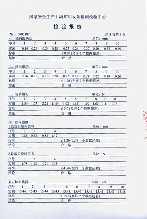 采用上述研究理論和工藝設(shè)計方法技術(shù)轉(zhuǎn)化生產(chǎn)的帶式輸送機托輥“礦安”檢測結(jié)果: