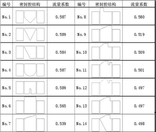 相同邊界下不同密封腔結(jié)構(gòu)及對(duì)應(yīng)流量系數(shù)實(shí)驗(yàn)表: