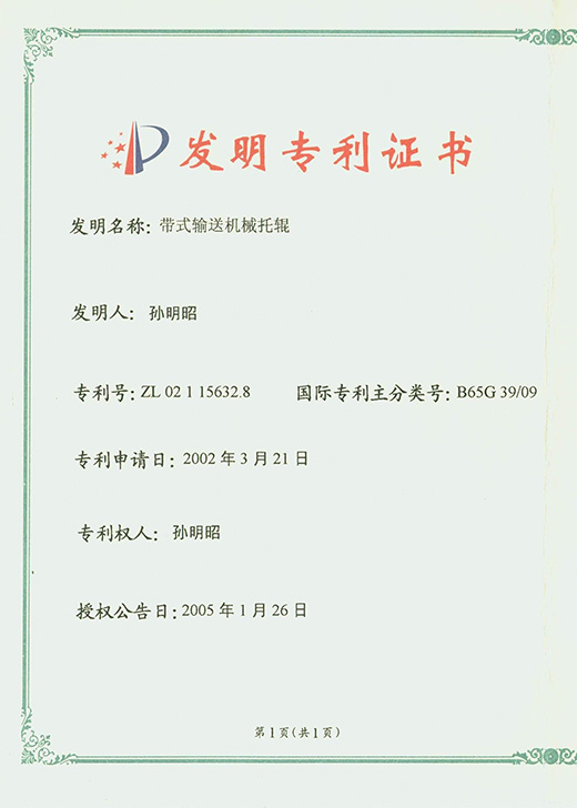 帶式輸送機(jī)托輥發(fā)明專利證書