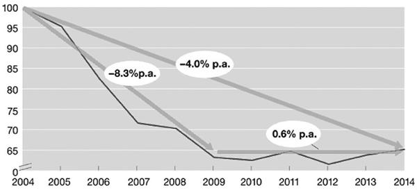 在過去的幾年里,我們不僅擴(kuò)大了采礦業(yè)研究的范圍,也加深了研究深度。因此,我們?cè)黾恿说V井樣本量,而且把觀測(cè)期拓展至2014年年末。接下來的分析將圍繞MineLens生產(chǎn)指數(shù)(又稱MPI)展開,MPI是關(guān)于礦井生產(chǎn)率趨勢(shì)的數(shù)據(jù)。最新的MPI數(shù)據(jù)顯示,總體而言,行業(yè)生產(chǎn)率在2009年后保持穩(wěn)定,但是絕對(duì)值只有10年前的30%。