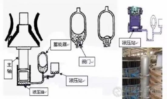 過(guò)鐵時(shí)液壓油注入蓄能器,主軸下墜,排料口增大
