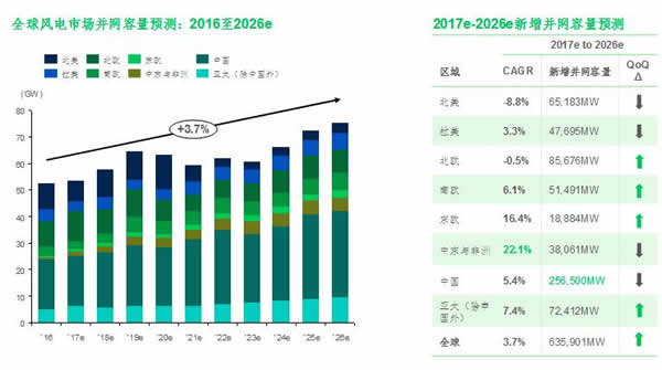 2017年二季度風(fēng)電市場展望:全球風(fēng)電新增容量十年預(yù)測上調(diào)10.8GW,未來五年內(nèi)將實(shí)現(xiàn)上調(diào)預(yù)測容量的60%。