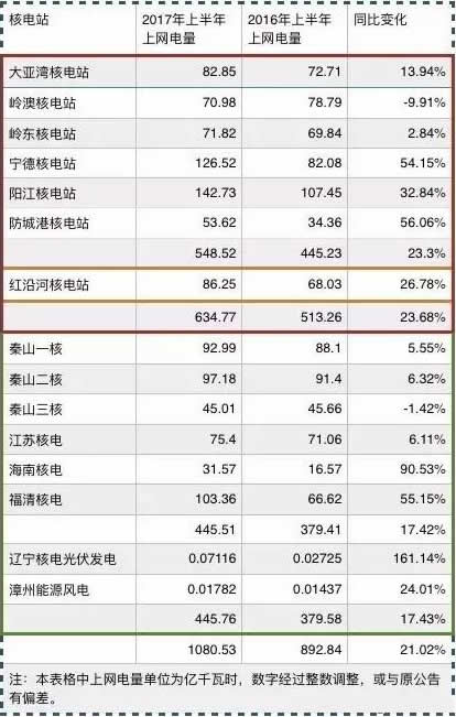 公告顯示,截至2017年6月30日,中國核電上半年累積商運發(fā)電量為477.79億千瓦時,上網(wǎng)電量為445.76億千萬時。不過,公告將漳州能源風電發(fā)電量和遼寧核電的光伏發(fā)電量也計入在內。eo剔除風光電量外,計算可得,中核電力純核電上網(wǎng)電量為445.51億千瓦時,比去年同期(379.41億千瓦時)同比上升17.42%。