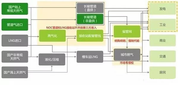 中國天然氣產(chǎn)業(yè)鏈如上圖所示。由于長輸管道和省管網(wǎng)、城市燃?xì)獾膲艛嗵攸c(diǎn),中國天然氣行業(yè)的主要利潤集中于中間環(huán)節(jié)。目前,中國進(jìn)口天然氣嚴(yán)重虧損,頁巖氣、煤制氣、煤層氣等非常規(guī)氣的供應(yīng)成本,在疊加現(xiàn)行的高額管輸、配送成本后,也無法實(shí)現(xiàn)盈虧平衡。這直接導(dǎo)致了2014~2016年期間的天然氣需求增速大幅滑落。