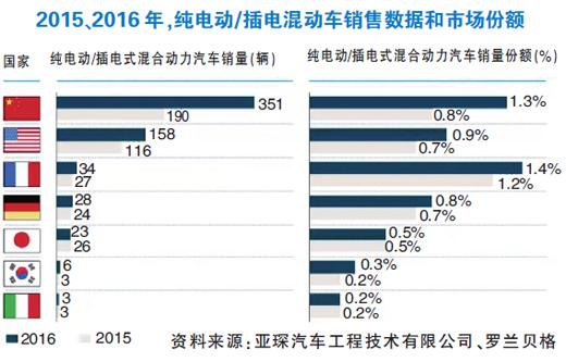 在市場(chǎng)規(guī)模層面,整體而言,2016年,僅有法國(guó)與中國(guó)兩個(gè)國(guó)家的純電動(dòng)和插電式混合動(dòng)力汽車(chē)市場(chǎng)份額超過(guò)1%。