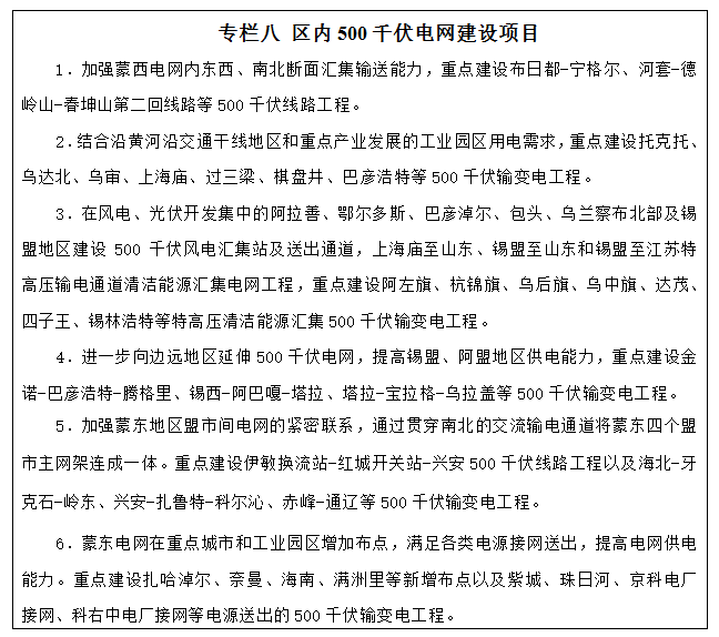 跨境輸電線路。繼續(xù)加大向奧云陶勒蓋、納林蘇海特和扎門烏德等主要城市、重點(diǎn)礦區(qū)和產(chǎn)業(yè)園區(qū)輸電,啟動(dòng)建設(shè)一批500/220千伏變電站及供電線路,推進(jìn)與蒙古國(guó)南部電網(wǎng)實(shí)現(xiàn)多點(diǎn)聯(lián)網(wǎng)。完善自治區(qū)邊境地區(qū)電網(wǎng),支持參與蒙古國(guó)電網(wǎng)建設(shè)與改造。