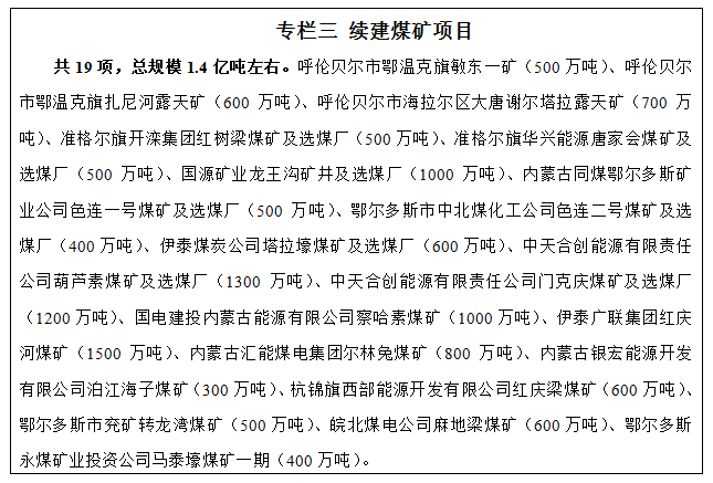 穩(wěn)步推進(jìn)煤炭生產(chǎn)基地建設(shè)。統(tǒng)籌安排煤炭總量和布局,依托勝利、五間房、白音華、準(zhǔn)格爾、東勝、上海廟、伊敏、寶日希勒等大型整裝煤田,按照國(guó)家總體能源戰(zhàn)略部署,重點(diǎn)圍繞保障煤電、現(xiàn)代煤化工等主要耗煤項(xiàng)目用煤需求,推動(dòng)鄂爾多斯、錫林郭勒、呼倫貝爾三大煤炭生產(chǎn)基地建設(shè),力爭(zhēng)到2020年原煤產(chǎn)量控制在11.5億噸左右?!笆濉逼陂g,建成投產(chǎn)煤礦項(xiàng)目35項(xiàng),總規(guī)模2.5億噸左右。續(xù)建煤礦項(xiàng)目19項(xiàng),總規(guī)模1.4億噸左右,其中鄂爾多斯1.2億噸、呼倫貝爾2000萬(wàn)噸左右。圍繞煤電和煤化工基地配套用煤項(xiàng)目,擬新開工并建成煤礦項(xiàng)目16項(xiàng),總規(guī)模1.2億噸左右,其中鄂爾多斯新增產(chǎn)能6500萬(wàn)噸、錫林郭勒新增產(chǎn)能4500萬(wàn)噸、通遼新增產(chǎn)能600萬(wàn)噸左右。