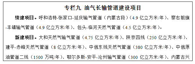 統(tǒng)籌考慮自治區(qū)石油天然氣資源以及煤制燃料項(xiàng)目建設(shè)情況,進(jìn)一步完善油氣管網(wǎng),提高油氣供應(yīng)保障能力?!笆濉逼陂g,建成陜京四線、中俄東線、建平-赤峰、呼和浩特-張家口-延慶輸氣管道(內(nèi)蒙古段)、包頭-臨河、大路-和林格爾、察右前旗-豐鎮(zhèn)輸氣管道和中俄原油管道二線等項(xiàng)目。根據(jù)市場(chǎng)發(fā)展及油氣源項(xiàng)目建設(shè)情況,適時(shí)推進(jìn)訥河-阿榮旗、張家口至錫林浩特、烏蘭察布-二連浩特、烏蘭察布-桑根達(dá)來(lái)-錫林浩特、桑根達(dá)來(lái)-克什克騰旗、中俄西線、杭錦旗-銀川天然氣管道、呼倫貝爾-齊齊哈爾-哈爾濱煤制氣、西氣東輸五線輸氣管道和蒙西、蒙東煤制油外輸管道等項(xiàng)目的前期工作?!笆濉逼陂g,力爭(zhēng)新增輸油能力1500萬(wàn)噸、輸氣能力657億立方米左右。加大油氣長(zhǎng)輸管道安全隱患排查和整改力度,持續(xù)開展油氣長(zhǎng)輸管道安全大排查、大整治專項(xiàng)行動(dòng)。加強(qiáng)儲(chǔ)氣設(shè)施建設(shè),進(jìn)一步提高天然氣調(diào)峰和應(yīng)急儲(chǔ)氣能力。
