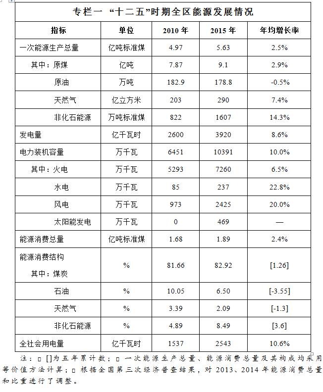 能源結(jié)構(gòu)不斷優(yōu)化?!笆濉逼陂g,全區(qū)能源結(jié)構(gòu)由傳統(tǒng)化石能源為主逐步向化石能源和非化石能源并重轉(zhuǎn)變,能源發(fā)展呈現(xiàn)出多元化、低碳化的特征。天然氣和非化石能源在一次能源生產(chǎn)總量中的比重分別提高至2015年的6.9%和2.9%,較2010年分別提高1.5個(gè)和1.2個(gè)百分點(diǎn);煤炭在一次能源生產(chǎn)總量中的比重降低至2015年的90%以下,較2010年下降2.6個(gè)百分點(diǎn);非化石能源裝機(jī)比重由2010年的16.4%提高至30.1%;非化石能源消費(fèi)比重提高至8.5%,“十二五”期間累計(jì)提高3.6個(gè)百分點(diǎn)。