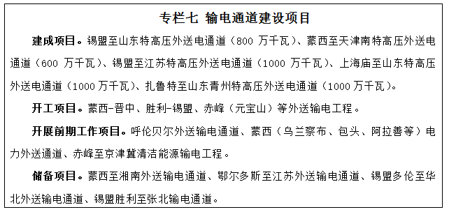 結(jié)合全國(guó)電力供需整體形勢(shì)、電源基地開發(fā)進(jìn)度等因素,堅(jiān)持適度超前的原則,采用大容量、遠(yuǎn)距離、高效率的特高壓先進(jìn)輸電技術(shù),加快電力外送通道及配套接網(wǎng)工程建設(shè),進(jìn)一步提高電力外送規(guī)模?!笆濉逼陂g,建成錫盟-山東、錫盟-江蘇、上海廟-山東、蒙西-天津南、扎魯特-山東青州等特高壓外送電通道。爭(zhēng)取開工建設(shè)蒙西-晉中、勝利-錫盟、赤峰(元寶山)等外送輸電工程。結(jié)合受端市場(chǎng)情況,積極推進(jìn)呼倫貝爾、蒙西(烏蘭察布、包頭、阿拉善等)、赤峰-京津冀等電力外送通道論證。力爭(zhēng)到2020年電力外送形成“兩交三直”特高壓、多條超高壓外送通道格局。