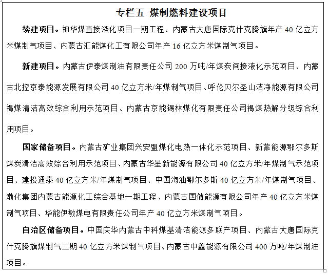 推進(jìn)煤制燃料升級(jí)示范。在現(xiàn)有煤制燃料示范項(xiàng)目的基礎(chǔ)上,按照節(jié)水、環(huán)保、高效的原則,重點(diǎn)在水煤組合條件較好的地區(qū),根據(jù)煤炭資源賦存、水資源和生態(tài)環(huán)境承載能力,按照項(xiàng)目前期工作和建設(shè)條件成熟程度,逐步推進(jìn)煤制油、煤制氣等煤制燃料產(chǎn)業(yè)高標(biāo)準(zhǔn)、高水平升級(jí)示范?!笆濉逼陂g,力爭(zhēng)新開工煤制油規(guī)模300萬(wàn)噸左右、煤制氣規(guī)模120億立方米左右。