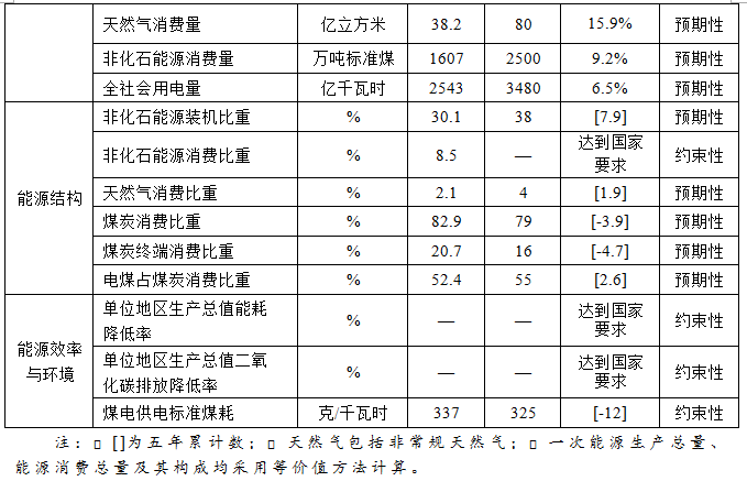 ――能源生產(chǎn)供應(yīng)。保持能源生產(chǎn)供應(yīng)穩(wěn)步增長(zhǎng),全區(qū)一次能源生產(chǎn)總量達(dá)到7億噸標(biāo)準(zhǔn)煤左右。原煤產(chǎn)量控制在11.5億噸左右,原油產(chǎn)量達(dá)到210萬(wàn)噸,天然氣(含非常規(guī)天然氣)產(chǎn)量達(dá)到300億立方米以上,非化石能源生產(chǎn)量達(dá)到3300萬(wàn)噸標(biāo)準(zhǔn)煤。電力裝機(jī)容量達(dá)到1.65億千瓦左右,其中火電1億千瓦、風(fēng)電4500萬(wàn)千瓦、光伏1500萬(wàn)千瓦左右。