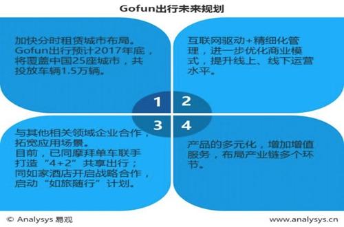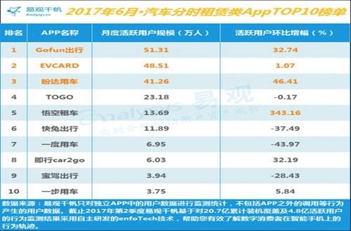 2017年8月8日,交通運輸部、住房城鄉(xiāng)建設部聯(lián)合發(fā)布《關(guān)于促進小微型客車租賃健康發(fā)展的指導意見》,鼓勵汽車分時租賃市場發(fā)展。 在資本助力及政策支持下,在消費升級的大背景下,未來,汽車分時租賃市場用戶規(guī)模將會保持穩(wěn)健增長態(tài)勢。 2017年6月,在汽車分時租賃TOP10榜單中,Gofun出行以51.31萬人的月活用戶規(guī)模位居榜首,EVCARD、盼達用車分別以48.51萬人、41.26萬人的月活用戶規(guī)模位列榜單第二、第三位。 Gofun出行是首汽集團旗下首汽智行科技有限公司打造的新能源汽車分時租賃項目,背靠首旅集團及首汽集團,在資本、場地、運營、品牌、充電設施等方面具先天優(yōu)勢。截止2017年7月底,Gofun出行共投入新能源汽車約1.2萬輛,覆蓋中國21個城市。
