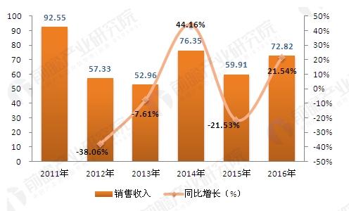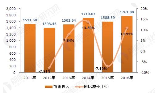 2011-2016年我國(guó)金屬機(jī)床行業(yè)銷售收入變化情況(單位:億元,%)