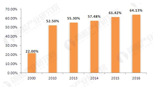 2000-2016年中國(guó)金屬切削機(jī)床產(chǎn)值數(shù)控化率(單位:%)
