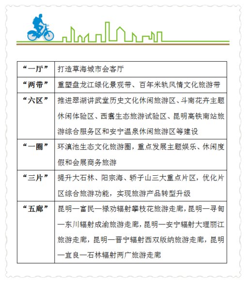 規(guī)劃提出,未來3年昆明要大力實施全域旅游發(fā)展戰(zhàn)略,實現(xiàn)把昆明建設(shè)成為世界知名旅游城市、國際旅游集散地和目的地。重點建設(shè)“一廳兩帶六區(qū)”“一圈三片五廊”。