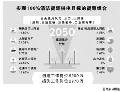 美國電氣與電子工程師協(xié)會(IEEE)旗下《光譜》雜志24日報道稱,新路線圖顯示,到2050年,通過太陽能、風(fēng)能、水力發(fā)電和地?zé)崮艿瓤稍偕茉矗?39個國家的用電需求可以100%得到滿足。